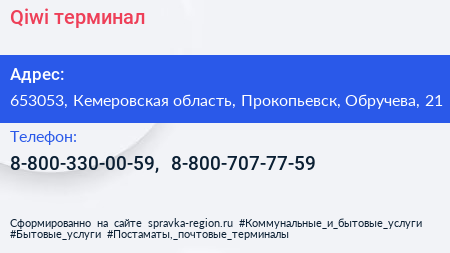 Qiwi, терминал по адресу 653053, Кемеровская область, Прокопьевск, Обручева, 21 в дальнейшем Организация, размещена в следующих категориях: