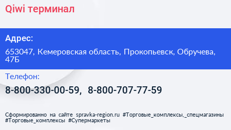 Qiwi, терминал по адресу 653047, Кемеровская область, Прокопьевск, Обручева, 47Б в дальнейшем Организация, размещена в следующих категориях: