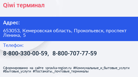 Qiwi, терминал по адресу 653053, Кемеровская область, Прокопьевск, проспект Ленина, 5 в дальнейшем Организация, размещена в следующих категориях: