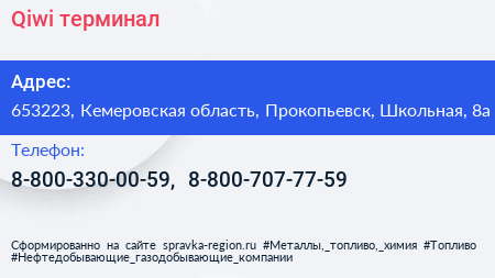 Qiwi, терминал по адресу 653223, Кемеровская область, Прокопьевск, Школьная, 8а в дальнейшем Организация, размещена в следующих категориях: