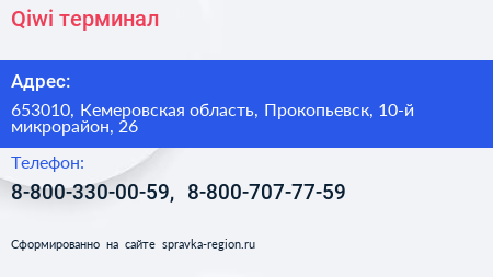 Qiwi, терминал по адресу 653010, Кемеровская область, Прокопьевск, 10-й микрорайон, 26 в дальнейшем Организация, размещена в следующих категориях: