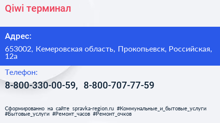 Qiwi, терминал по адресу 653002, Кемеровская область, Прокопьевск, Российская, 12а в дальнейшем Организация, размещена в следующих категориях: