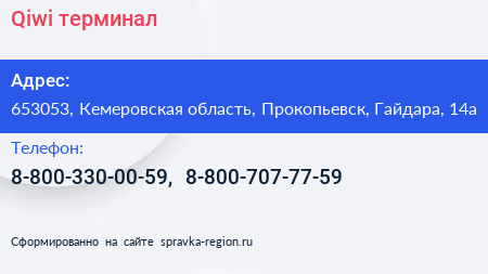 Qiwi, терминал по адресу 653053, Кемеровская область, Прокопьевск, Гайдара, 14а в дальнейшем Организация, размещена в следующих категориях: