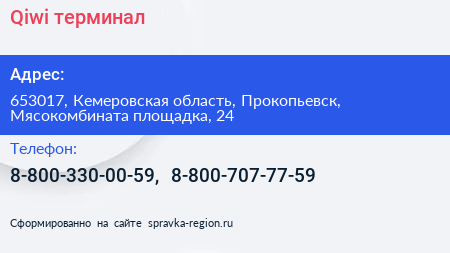 Qiwi, терминал по адресу 653017, Кемеровская область, Прокопьевск, Мясокомбината площадка, 24 в дальнейшем Организация, размещена в следующих категориях: