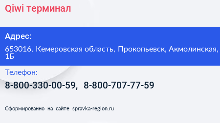 Qiwi, терминал по адресу 653016, Кемеровская область, Прокопьевск, Акмолинская, 1Б в дальнейшем Организация, размещена в следующих категориях: