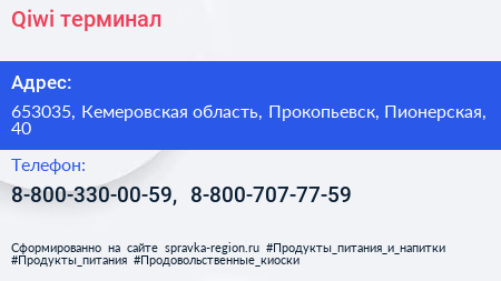 Qiwi, терминал по адресу 653035, Кемеровская область, Прокопьевск, Пионерская, 40 в дальнейшем Организация, размещена в следующих категориях: