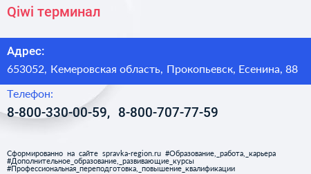 Qiwi, терминал по адресу 653052, Кемеровская область, Прокопьевск, Есенина, 88 в дальнейшем Организация, размещена в следующих категориях: