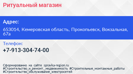 Ритуальный магазин по адресу 653014, Кемеровская область, Прокопьевск, Вокзальная, 67а в дальнейшем Организация, размещена в следующих категориях: