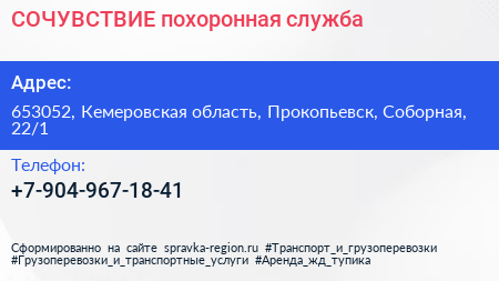 СОЧУВСТВИЕ, похоронная служба по адресу 653052, Кемеровская область, Прокопьевск, Соборная, 22/1 в дальнейшем Организация, размещена в следующих категориях: