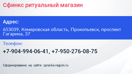 Сфинкс, ритуальный магазин по адресу 653039, Кемеровская область, Прокопьевск, проспект Гагарина, 37 в дальнейшем Организация, размещена в следующих категориях: