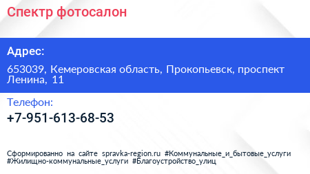 Спектр, фотосалон по адресу 653039, Кемеровская область, Прокопьевск, проспект Ленина, 11 в дальнейшем Организация, размещена в следующих категориях: