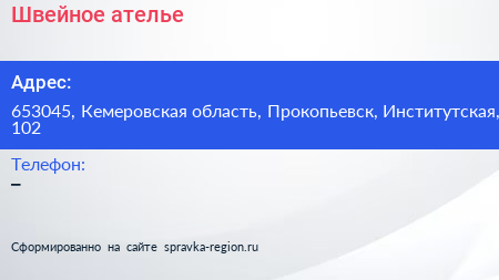 Швейное ателье по адресу 653045, Кемеровская область, Прокопьевск, Институтская, 102 в дальнейшем Организация, размещена в следующих категориях: