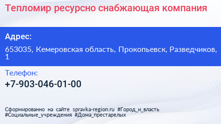 Тепломир, ресурсно-снабжающая компания по адресу 653035, Кемеровская область, Прокопьевск, Разведчиков, 1 в дальнейшем Организация, размещена в следующих категориях: