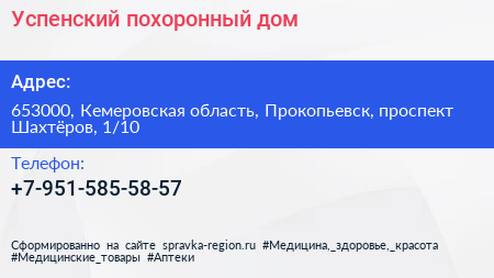 Успенский похоронный дом по адресу 653000, Кемеровская область, Прокопьевск, проспект Шахтёров, 1/10 в дальнейшем Организация, размещена в следующих категориях: