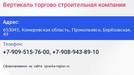 Вертикаль, торгово-строительная компания по адресу 653045, Кемеровская область, Прокопьевск, Берёзовская, 49 в дальнейшем Организация, размещена в следующих категориях: