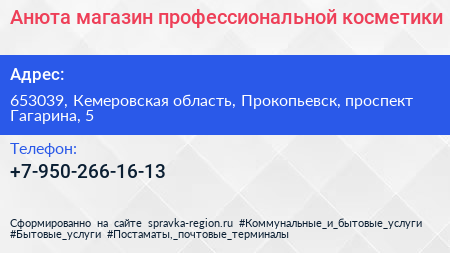 Анюта, магазин профессиональной косметики по адресу 653039, Кемеровская область, Прокопьевск, проспект Гагарина, 5 в дальнейшем Организация, размещена в следующих категориях: