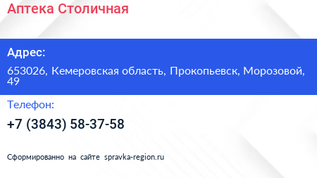 Аптека Столичная по адресу 653026, Кемеровская область, Прокопьевск, Морозовой, 49 в дальнейшем Организация, размещена в следующих категориях: