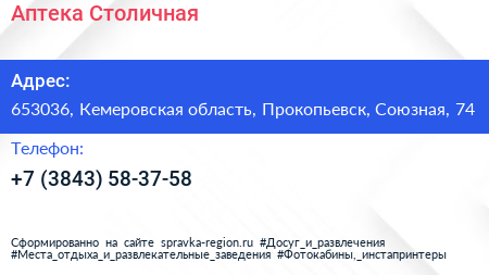 Аптека Столичная по адресу 653036, Кемеровская область, Прокопьевск, Союзная, 74 в дальнейшем Организация, размещена в следующих категориях: