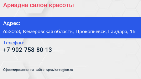 Ариадна, салон красоты по адресу 653053, Кемеровская область, Прокопьевск, Гайдара, 16 в дальнейшем Организация, размещена в следующих категориях: