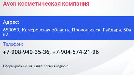 Avon, косметическая компания по адресу 653053, Кемеровская область, Прокопьевск, Гайдара, 50а к9 в дальнейшем Организация, размещена в следующих категориях: