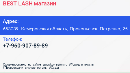 BEST LASH, магазин по адресу 653039, Кемеровская область, Прокопьевск, Петренко, 25 в дальнейшем Организация, размещена в следующих категориях: