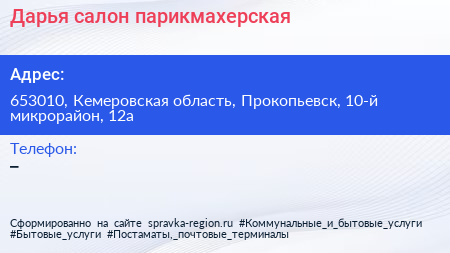Дарья, салон-парикмахерская по адресу 653010, Кемеровская область, Прокопьевск, 10-й микрорайон, 12а в дальнейшем Организация, размещена в следующих категориях: