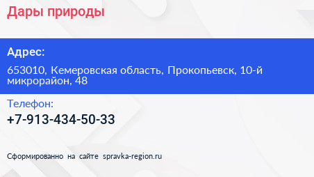 Дары природы по адресу 653010, Кемеровская область, Прокопьевск, 10-й микрорайон, 48 в дальнейшем Организация, размещена в следующих категориях: