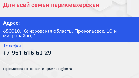 Для всей семьи, парикмахерская по адресу 653010, Кемеровская область, Прокопьевск, 10-й микрорайон, 1 в дальнейшем Организация, размещена в следующих категориях: