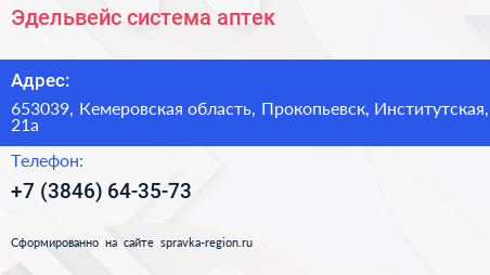 Эдельвейс, система аптек по адресу 653039, Кемеровская область, Прокопьевск, Институтская, 21а в дальнейшем Организация, размещена в следующих категориях: