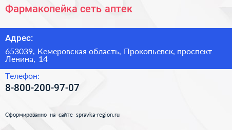 Фармакопейка, сеть аптек по адресу 653039, Кемеровская область, Прокопьевск, проспект Ленина, 14 в дальнейшем Организация, размещена в следующих категориях: