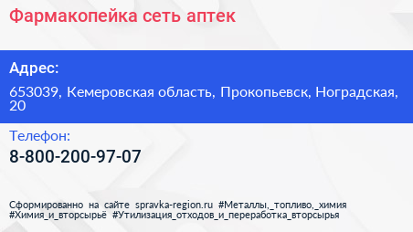 Фармакопейка, сеть аптек по адресу 653039, Кемеровская область, Прокопьевск, Ноградская, 20 в дальнейшем Организация, размещена в следующих категориях: