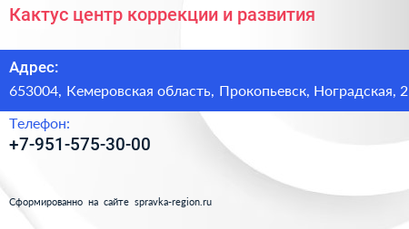 Кактус, центр коррекции и развития по адресу 653004, Кемеровская область, Прокопьевск, Ноградская, 2 в дальнейшем Организация, размещена в следующих категориях:
