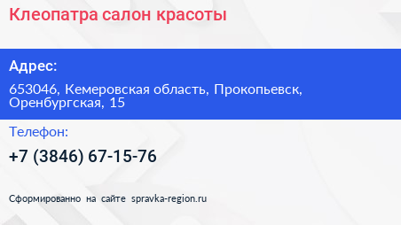 Клеопатра, салон красоты по адресу 653046, Кемеровская область, Прокопьевск, Оренбургская, 15 в дальнейшем Организация, размещена в следующих категориях: