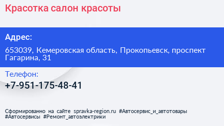 Красотка, салон красоты по адресу 653039, Кемеровская область, Прокопьевск, проспект Гагарина, 31 в дальнейшем Организация, размещена в следующих категориях: