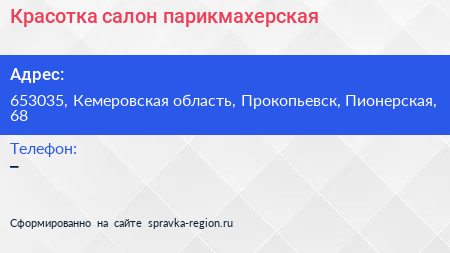 Красотка, салон-парикмахерская по адресу 653035, Кемеровская область, Прокопьевск, Пионерская, 68 в дальнейшем Организация, размещена в следующих категориях: