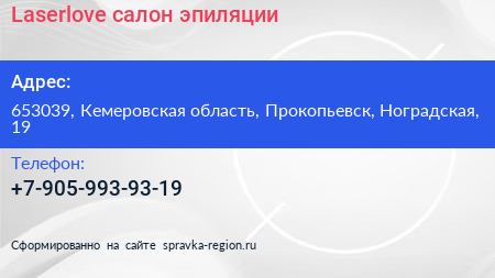 Laserlove, салон эпиляции по адресу 653039, Кемеровская область, Прокопьевск, Ноградская, 19 в дальнейшем Организация, размещена в следующих категориях: