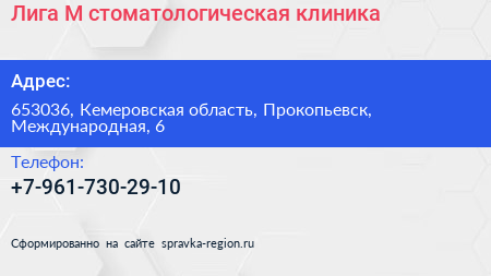 Лига-М, стоматологическая клиника по адресу 653036, Кемеровская область, Прокопьевск, Международная, 6 в дальнейшем Организация, размещена в следующих категориях:
