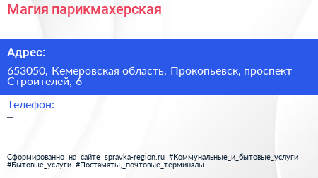 Магия, парикмахерская по адресу 653050, Кемеровская область, Прокопьевск, проспект Строителей, 6 в дальнейшем Организация, размещена в следующих категориях: