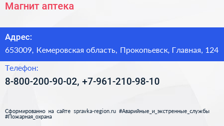 Магнит, аптека по адресу 653009, Кемеровская область, Прокопьевск, Главная, 124 в дальнейшем Организация, размещена в следующих категориях:
