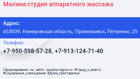 Малина, студия аппаратного массажа по адресу 653039, Кемеровская область, Прокопьевск, Петренко, 25 в дальнейшем Организация, размещена в следующих категориях: