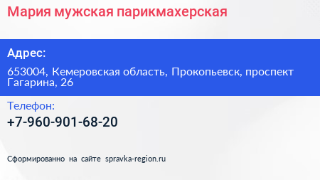 Мария, мужская парикмахерская по адресу 653004, Кемеровская область, Прокопьевск, проспект Гагарина, 26 в дальнейшем Организация, размещена в следующих категориях: