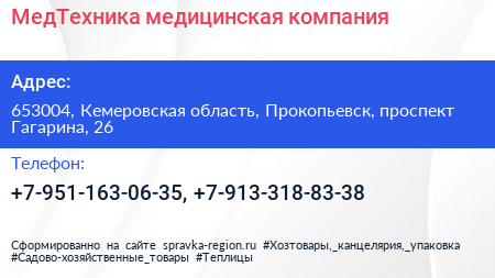 МедТехника, медицинская компания по адресу 653004, Кемеровская область, Прокопьевск, проспект Гагарина, 26 в дальнейшем Организация, размещена в следующих категориях: