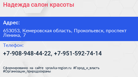 Надежда, салон красоты по адресу 653053, Кемеровская область, Прокопьевск, проспект Ленина, 7 в дальнейшем Организация, размещена в следующих категориях: