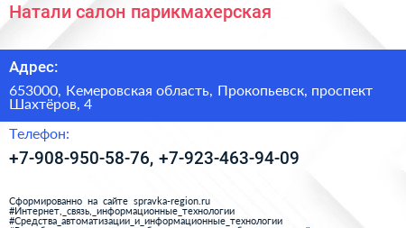 Натали, салон-парикмахерская по адресу 653000, Кемеровская область, Прокопьевск, проспект Шахтёров, 4 в дальнейшем Организация, размещена в следующих категориях:
