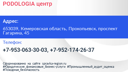 PODOLOGIA, центр по адресу 653039, Кемеровская область, Прокопьевск, проспект Гагарина, 45 в дальнейшем Организация, размещена в следующих категориях: