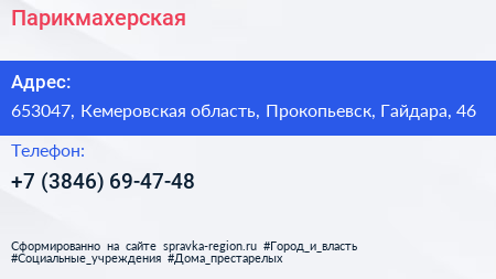 Парикмахерская по адресу 653047, Кемеровская область, Прокопьевск, Гайдара, 46 в дальнейшем Организация, размещена в следующих категориях: