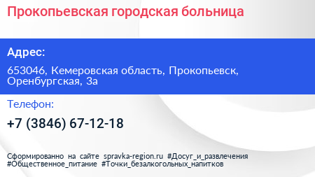 Прокопьевская городская больница по адресу 653046, Кемеровская область, Прокопьевск, Оренбургская, 3а в дальнейшем Организация, размещена в следующих категориях: