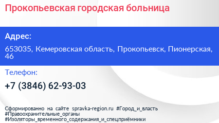 Прокопьевская городская больница по адресу 653035, Кемеровская область, Прокопьевск, Пионерская, 46 в дальнейшем Организация, размещена в следующих категориях: