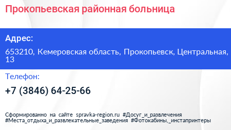 Прокопьевская районная больница по адресу 653210, Кемеровская область, Прокопьевск, Центральная, 13 в дальнейшем Организация, размещена в следующих категориях: