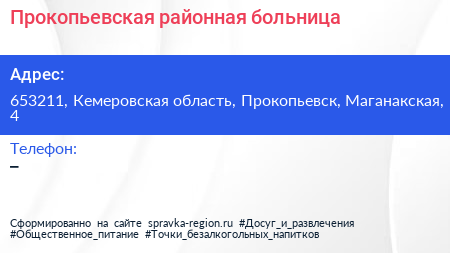 Прокопьевская районная больница по адресу 653211, Кемеровская область, Прокопьевск, Маганакская, 4 в дальнейшем Организация, размещена в следующих категориях: